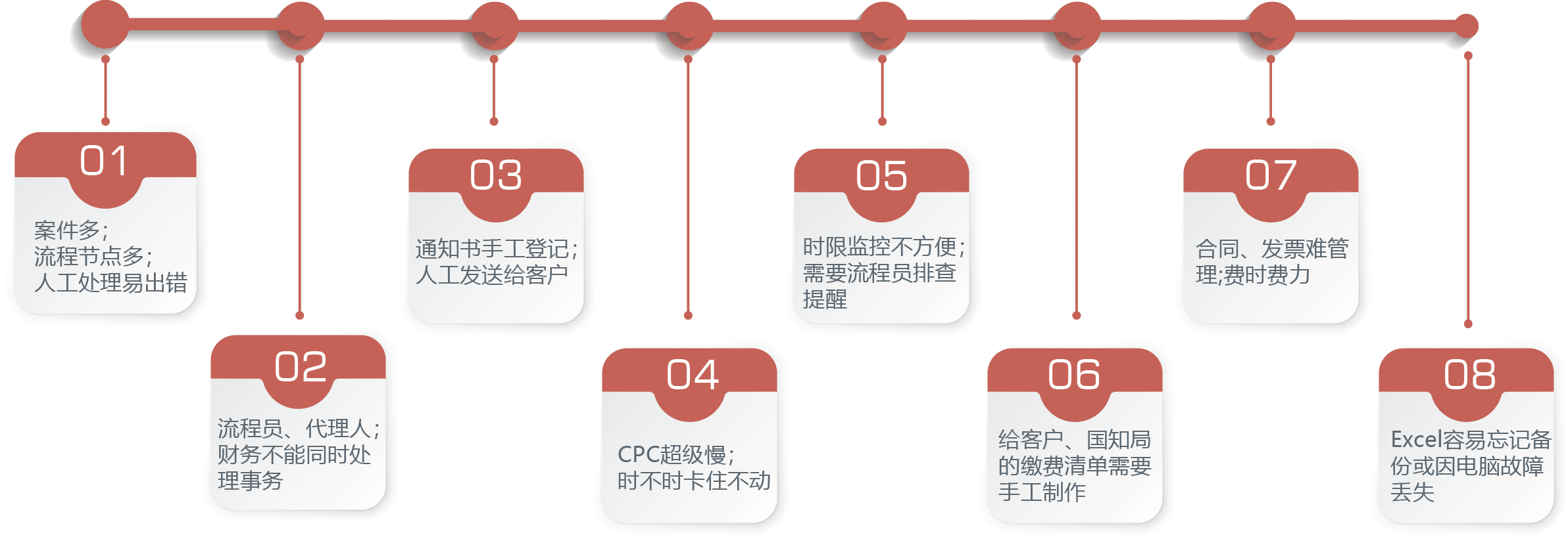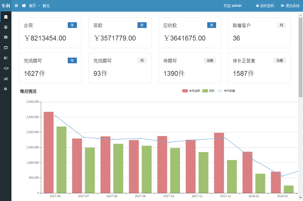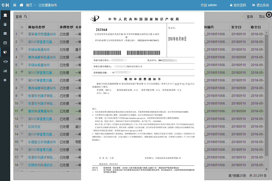 本系統(tǒng)是一套專利代理事務(wù)所業(yè)務(wù)全流程解決方案系統(tǒng),主要基于事務(wù)所日常業(yè)務(wù)需求所進(jìn)行研發(fā),實現(xiàn)從新客戶維護、簽定合同、分案、撰寫、審核、遞交、國知局答復(fù)、授權(quán)、年費維持等各階段全面的監(jiān)控管理。本項業(yè)務(wù)的實施單位為江蘇佰騰科技有限公司。