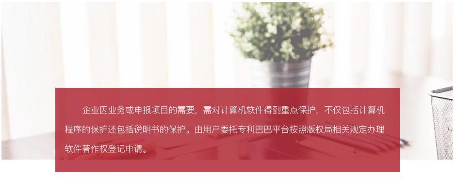 企業因業務或申報項目的需要,需對計算機軟件得到重點保護,不僅包括計算機程序的保護還包括說明書的保護。由用戶委托專利巴巴平臺按照版權局相關規定辦理軟件著作權登記申請。本項業務的實施單位為常州佰業騰飛專利代理事務所(普通合伙)。