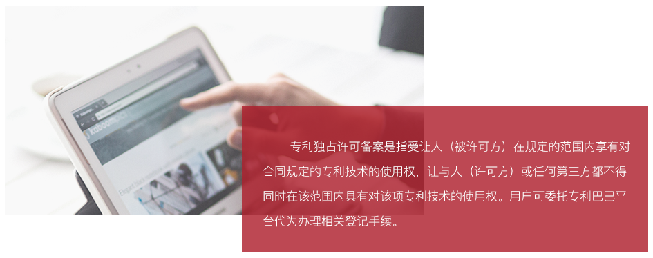 受讓人(被許可方)在規定的范圍內享有對合同規定的專利技術的使用權,讓與人(許可方)或任何第三方都不得同時在該范圍內具有對該項專利技術的使用權。用戶可委托專利巴巴平臺代為辦理相關登記手續。本項業務的實施單位為常州佰業騰飛專利代理事務所(普通合伙)。