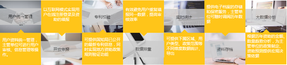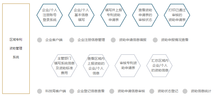 專利資助系統分企業/個人用戶端和主管部門用戶端,通過企業/個人在線填報,并對填報申報資助的基 本條件進行驗證,符合要求才可以進行提交主管部門進行審核,系統可以按各地的資助政策進行定制開發。