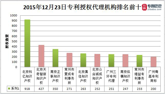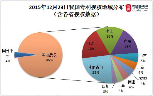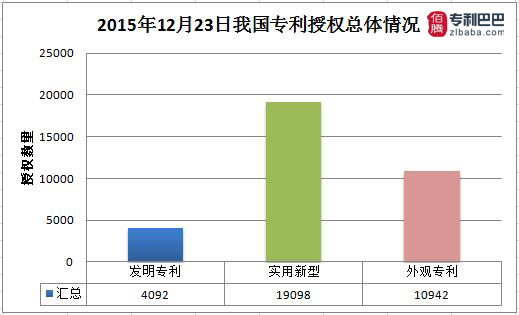 由專利巴巴數據監控中心統計,2015年12月23日中國專利授權數據共34132件。