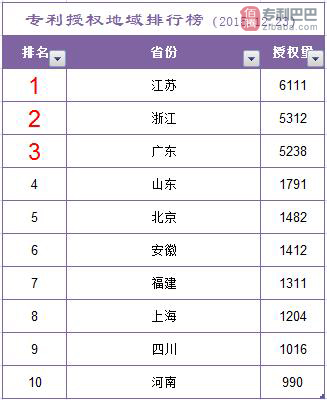 經過對國省代碼進行分析,本周國外來華授權專利共1351件,國內專利授權共32781件。其中江蘇省以6111件專利授權量繼續穩居首席,浙江(5312件)、廣東(5238件)、山東(1791件),北京(1482件)、安徽(1412件)分別居于授權量排行榜的2到5名。與上周相比,本周各省的授權量均有所下降。